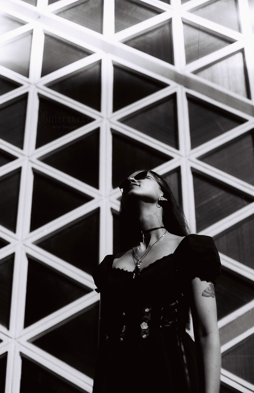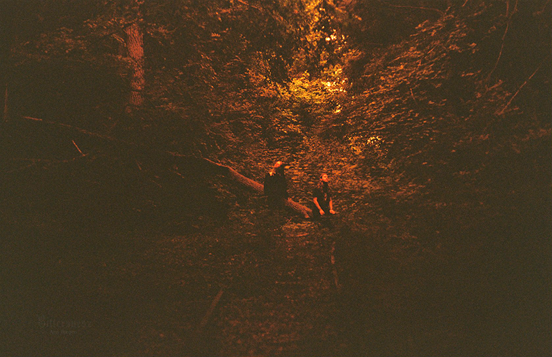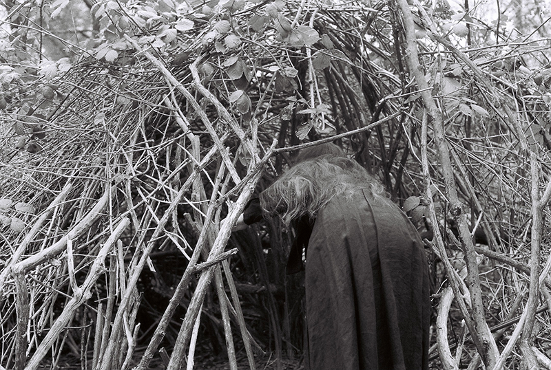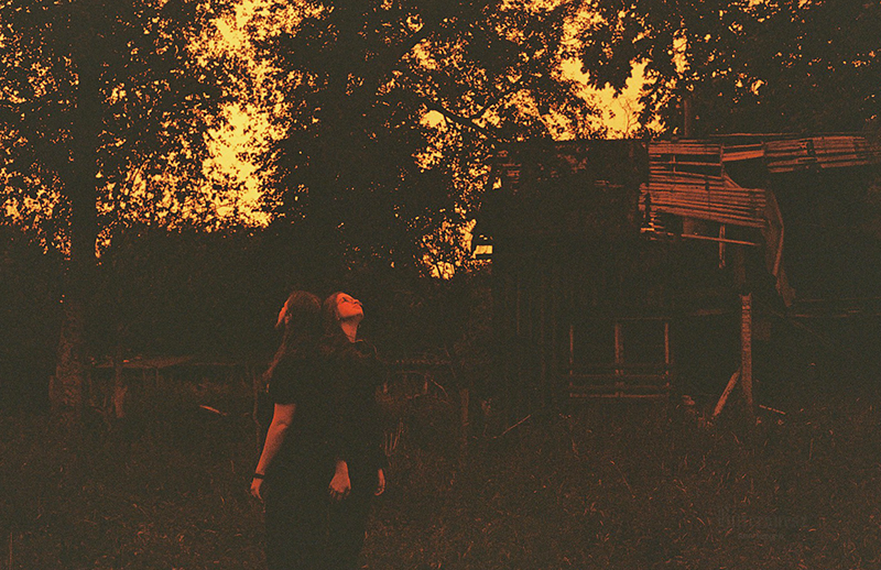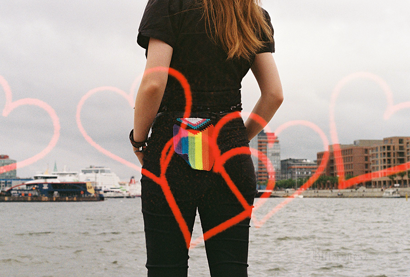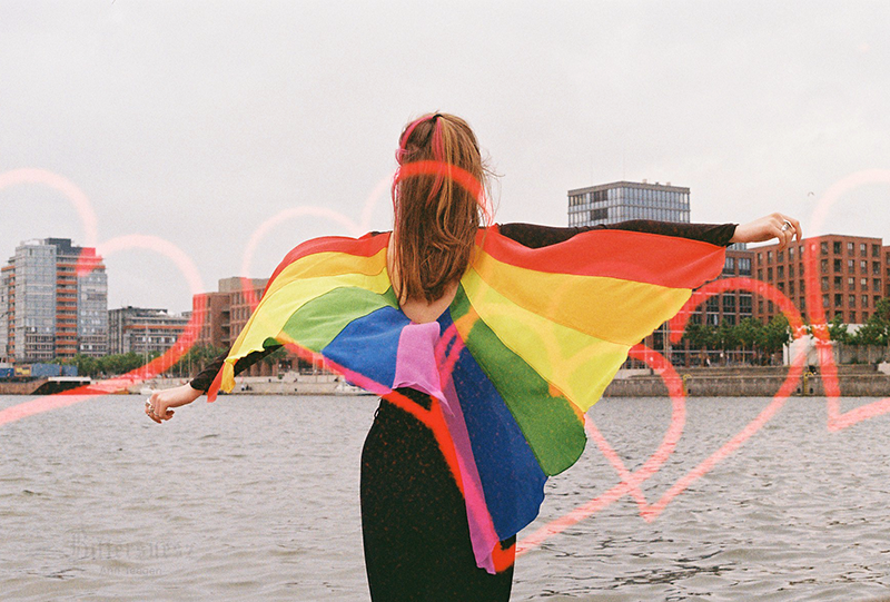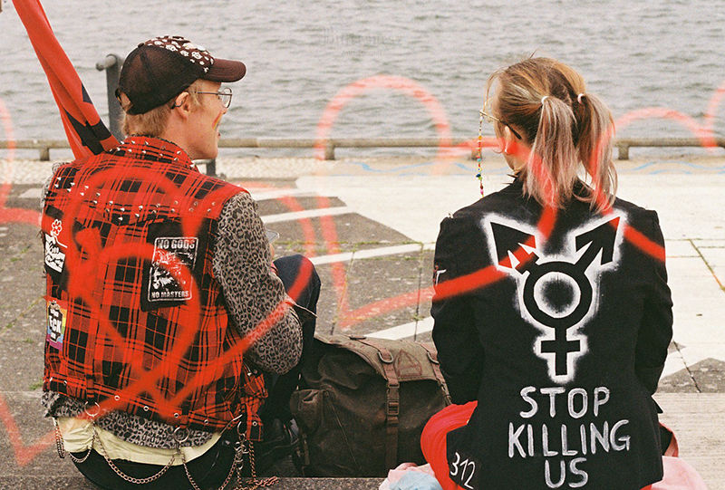 Farbfilmfoto zweier sitzender Punks, von hinten aufgenommen, auf der einen Jacke ein Trans-Symbol und die Worte "Stop killing us" Ann, seitlich fotografiert, mit Carl, ihrem niedlichen großen grauen Stoff-Brontosaurier unterm Arm auf einer frostbedeckten Rasenfläche. Ann trägt einen gelben Mantel, eine dunkelrote Mütze und einen rostfarbenen langen Leinenrock. Ihr sehr langes kastanienbraunes Haare ist offen. Carl trägt eine gelbe Schleife. Im Hintergrund sind Brombeerbüsche und efeubewachsene Bäume. Farbfilmfoto einer blonden Frau von hinten fotografiert an der Kieler Hörn, an ihrem Gürtel eine gestrickte progress pride flag Farbfilmfoto einer blonden Frau mit Regenbogencape, von hinten fotografiert, auf die Kieler Hörn hinausblickend