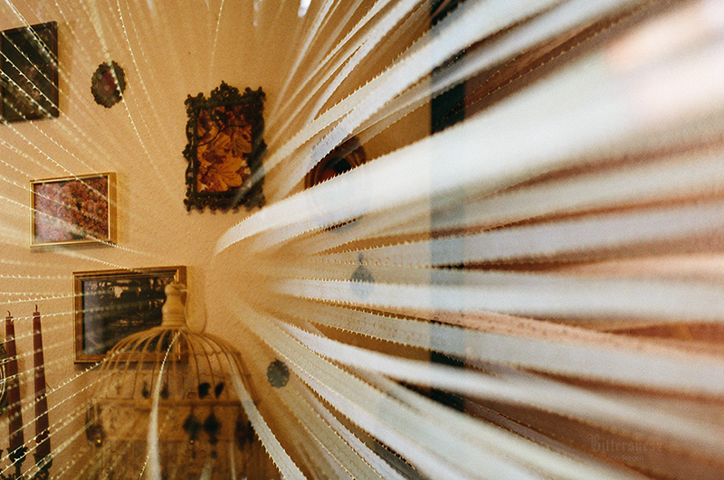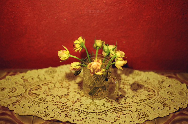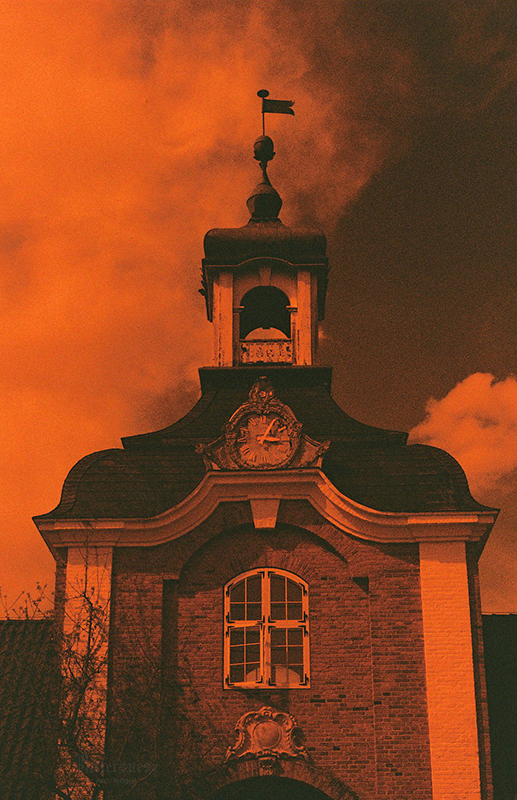Redscale-Foto eines Torhauses mit Türmchen Schwarzweiß-Film-Foto eines bemalten Hauses mit der Aufschrift „Das verzauberte Hexenhaus“ Redscale-Foto eines antiken Kettenkarussells Farbfilmfoto von kleinen cremefarbenen Rosen in einem Glas auf einem alten weißen Spitzendeckchen