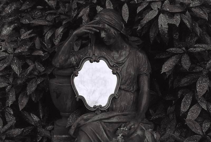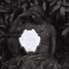 Recht dunkles Schwarzweiß-Film-Foto einer Statue, die ihren Kopf auf eine Hand stützt und den Ellbogen auf eine Säule. Um die Statue herum ist Rhododendron, im Hintergrund sind Bäume, mit viel Bokeh.